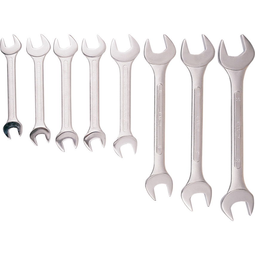 A készlet tartalma: 24 x 26 mm, 25 x 28 mm, 27 x 30 mm, 27 x 32 mm, 32 x 36 mm, 36 x 41 mm, 41 x 46 mm és 46 x 50 mm-es kulcsok.