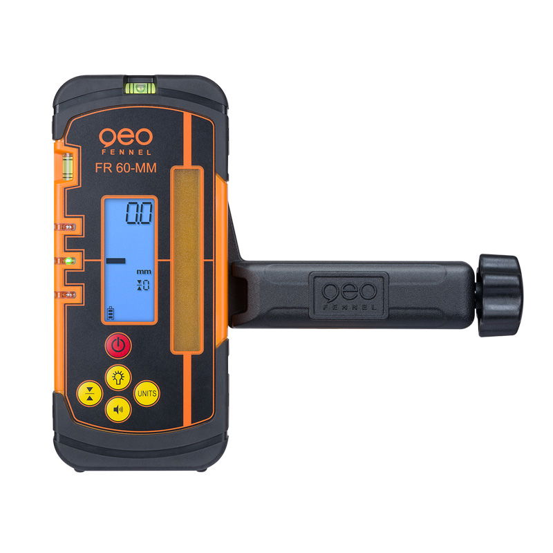 geo-FENNEL FR 60 lézeres vevőegység digitális lézermagasság-kijelzéssel rendelkezik milliméterben, 60 mm hosszúságú vételi ablakkal, és ideális vörös vagy zöld lézersugárral működő forgólézerekhez. Az FR 50-hez hasonlóan az FR 60-MM robusztus házzal rendelkezik, IP67 védettséggel por és víz ellen, valamint nagy méretű, könnyen leolvasható, megvilágított kijelzővel.